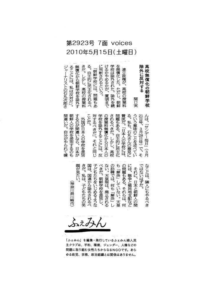 20100515・ふぇみん・高校無償化の朝鮮学校除外に反対する