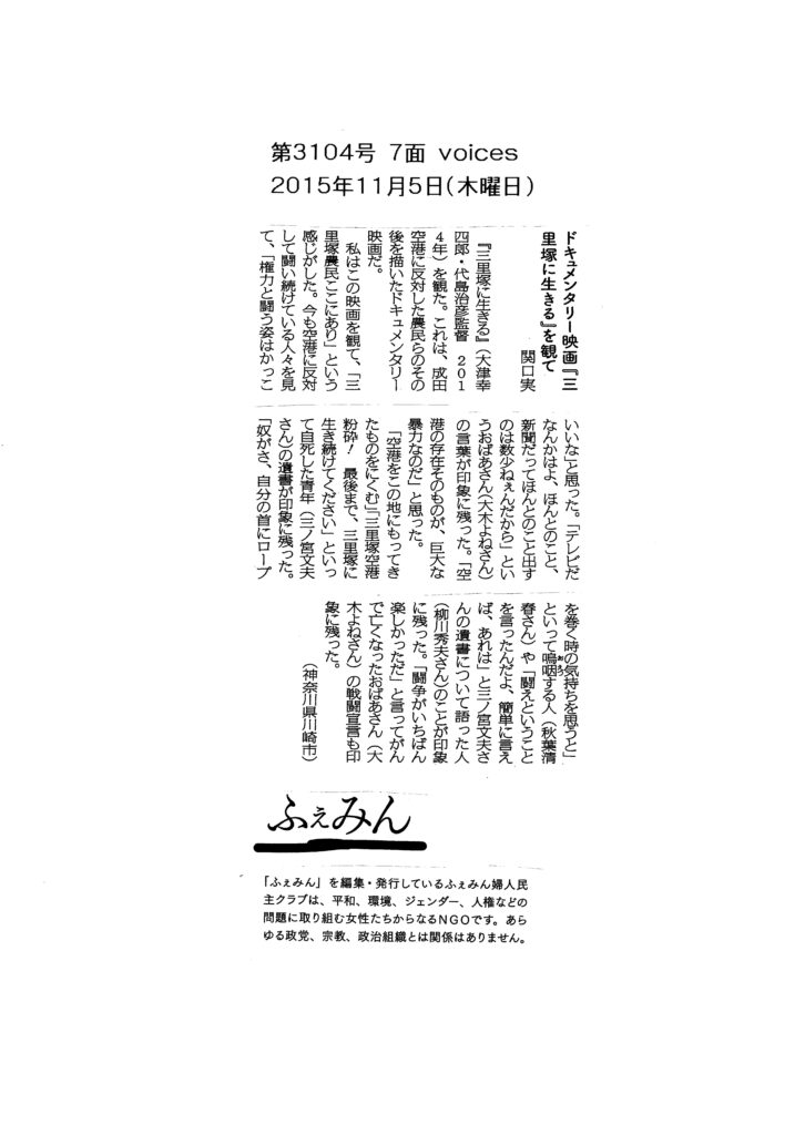 20151105・ふぇみん・ドキュメンタリー映画『三里塚に生きる』を観て