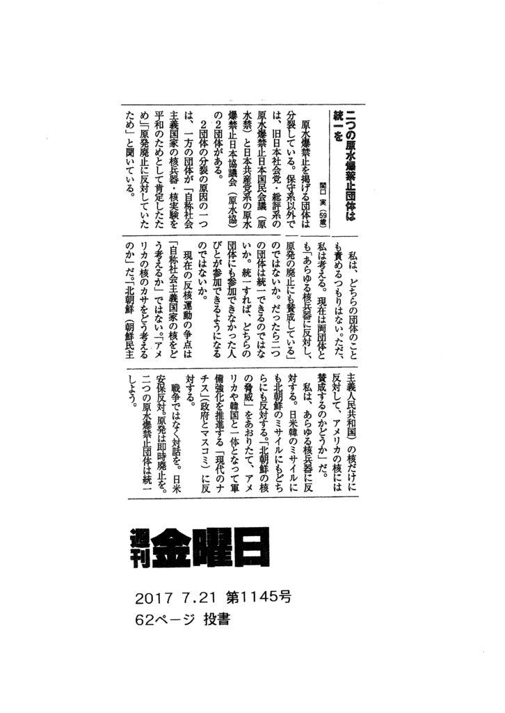 20170721・金曜日・二つの原水爆禁止団体は統一を