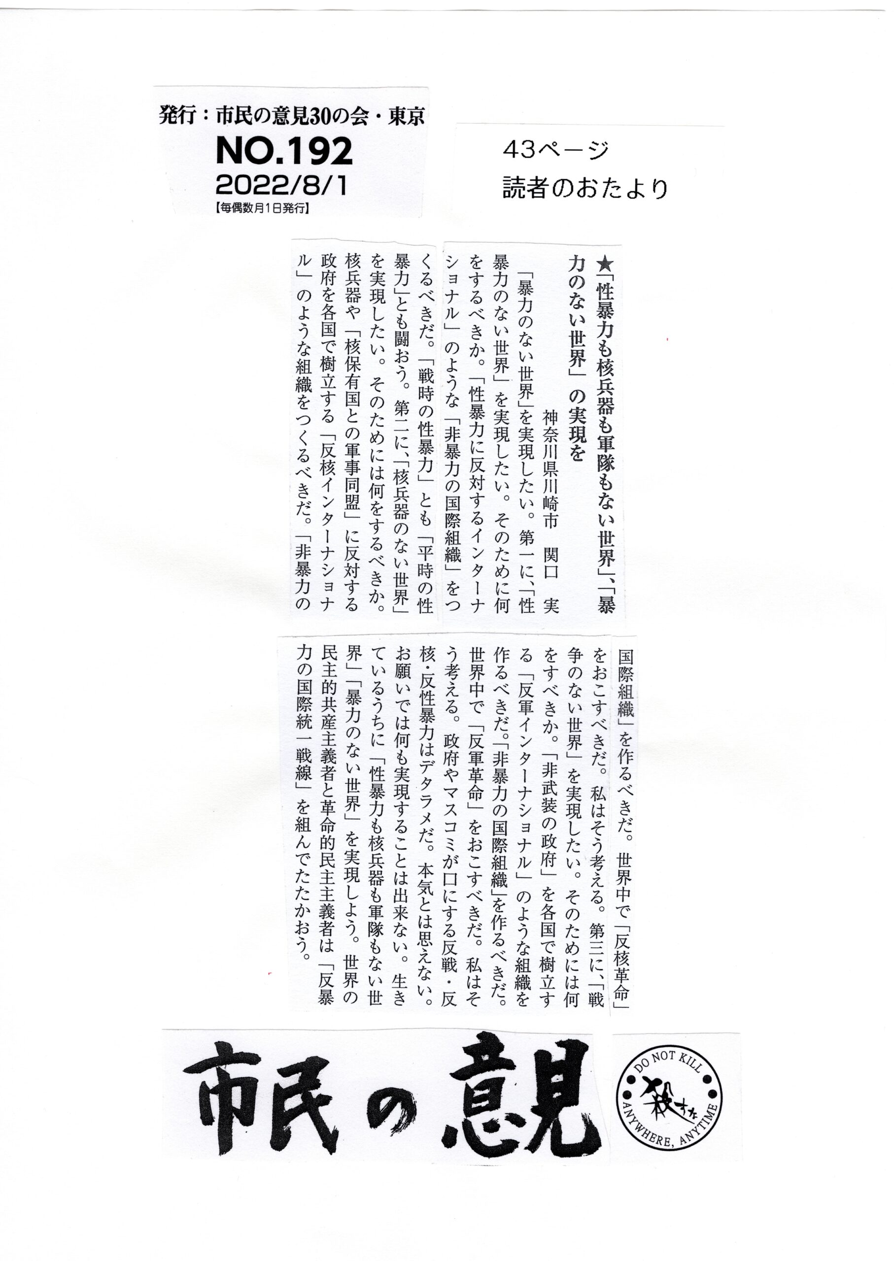 20220801・市民の意見・「性暴力も核兵器も軍隊もない世界」、「暴力のない世界」の実現を