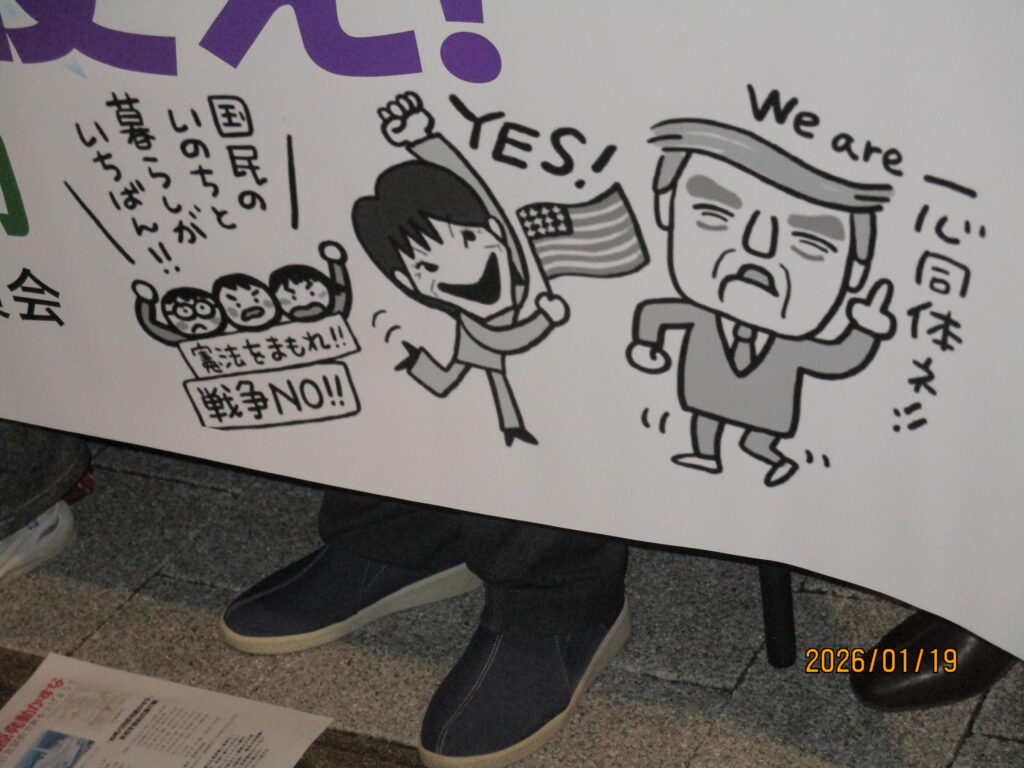 【集会のタイトル等について】集会のタイトルが「戦争させない・9条壊すな!総がかり行動実行委員会」のホームページに載っていたもの(戦争反対!憲法守れ!核も原発もいらない!1・19国会議員会館前行動)と司会者がいっていたもの(略)と『しんぶん赤旗』に載っていたもの(暮らしそっちのけ解散 税金は暮らしに使え!19日行動)とみんな違っていたので関係者に確認したところ「横断幕に書かれていたものが正しい」ということだった。なお、参加者は約700人。寒さにも負けず、約1時間スタンディングデモに参加した。